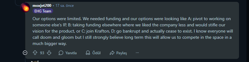 Stüdyonun kurucusu Judd Cobler, bu tedirginliği dindirmek adına bir açıklama yayınladı. Krafton haberlerinin ardından oyunun subreddit’inde bir açıklama yayınlayan Cobler, Krafton’un kararlarından etkilenmediklerini ve aktif şekilde işe alım yaptıklarını ifade etti. Krafton tarafından satın alınma konularına ise net bir yanıt verdi.