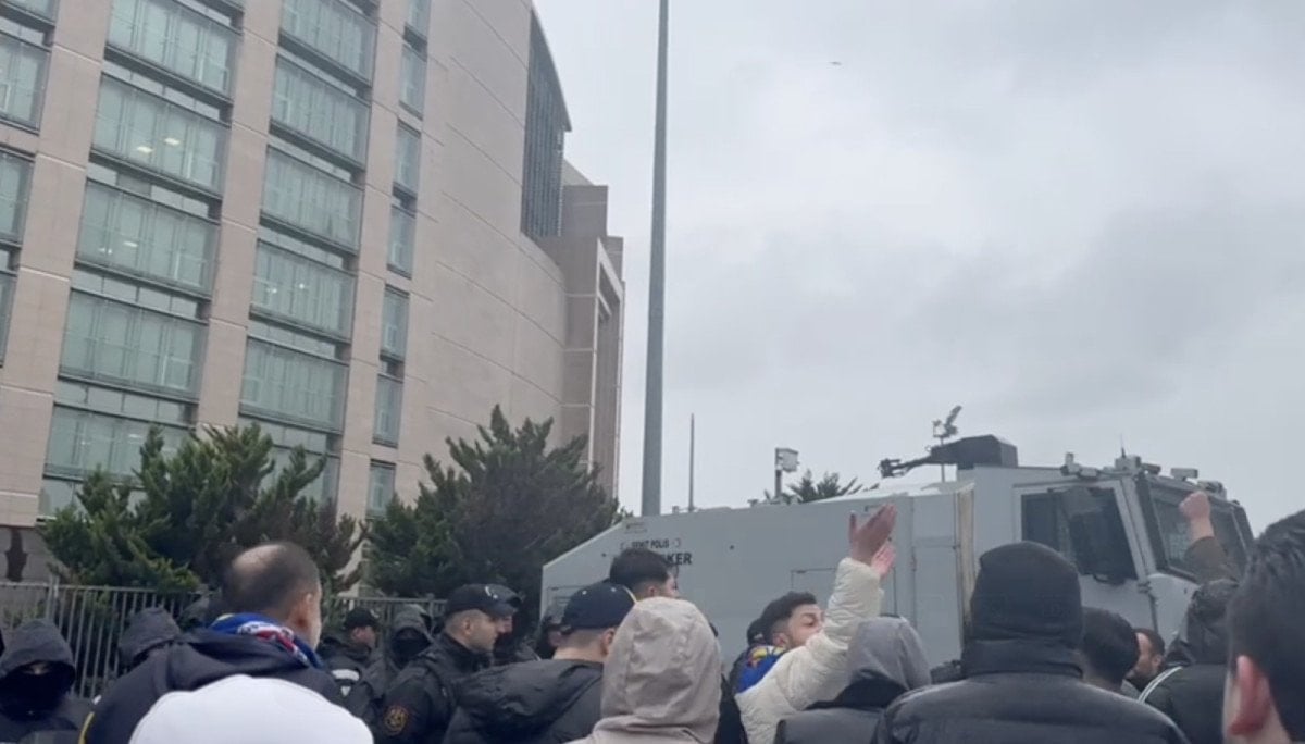 Adliyenin etrafında geniş güvenlik önlemleri alınırken Fenerbahçeli taraftarlar, Saran’a destek için adliye çevresinde toplandı.
